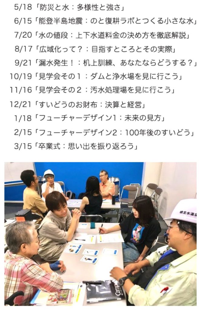 C-2-2 すいどう塾 C-2-2すいどう塾 内容・方法・活動 結果 特記事項 ※ 動画が入ります インタビュー記事を見る 内容・方法・活動 結果 特記事項 インタビュー記事を見る 内容・方法・活動 結果 特記事項 内容・方法・活動 山梨大学、山梨県立大学、甲州市がモデレーター、NPO等がコーディネーターとなり、地域住民および移住者、訪問者とも情報を交換しながら互助ネットワーク「共創の場」を形成する。さらに、小さな水サービスの導入とともに、その水サービスを活かした共体験(地域の親水活動、水源保全活動、花木や作物等の栽培・植栽、環境の理解や教育のためのセミナー)を演出する。その結果、社会的効用がどれだけ創出されたかをヒアリングなどによって明らかにする。社会的効用創出の結果を、共創の場あるいは共体験の方法などにフィードバックさせ、改善を図る。 結果 2023年5月に協働実施者により開かれた市民科学の場である。継続的な勉強会を通して自治体の上下水道運営に対する理解を促し、将来的に住民参加型の意思決定の実現を目指している。同様な趣旨で先進的に取り組んでいる岩手県矢巾町の例を参考とした。初年度は北杜市民を対象とし、登録塾生数は14人、オブザーバーとして小さな水メンバー、大学生、近隣在住者等が参加。全11回、毎月第3土曜日午前の1時間半程度、インフラ、検針、漏水、経営、そして小さな水事業など、給水と排水に関わる幅広い内容を、市民、行政、技術者、研究者ら多様なステークホルダーがともに学ぶ機会が作られた(図C-2-2)。 図C-2-2 2024年のメニュー(上)、「漏水発生!机上訓練」の様子(下) 特記事項 2023年は市街地から離れた北杜市役所支所で開催していたが、参加人数の減少、講義内容とスタイルに課題が見出されたため、2024年は参加者を北杜市以外に広げ、場所を市民ホールに移した。能登とのオンライン接続、机上訓練ゲーム、ウォーキング見学会、フューチャデザインなど、「わかる!楽しい!深い!」をモットーに内容と方法もより双方向的に参加できる工夫を加えた。水道料金の改定は参加者の最大の関心事の一つであるが、公営企業会計の知識が高まるとともに、地方行財政やナショナル・ミニマムといった大きな社会課題にも議論が重なり始めている。すいどう塾を普及させるために、また、大きなと小さな水の共存というテーマを模索し続けるためにも、全国を視野に入れた展開を検討する価値はあると思われる。